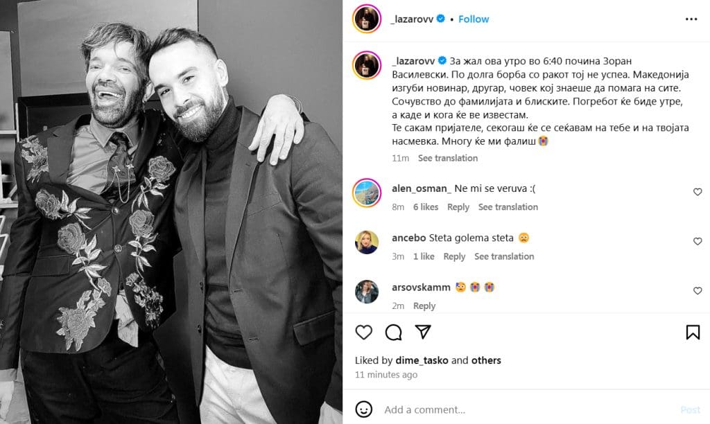 „За жал, утрово во 6.40 почина Зоран Василевски. По долга борба со ракот, тој не успеа. Македонија изгуби новинар, другар, човек кој знаеше да помага на сите.