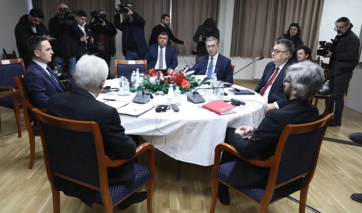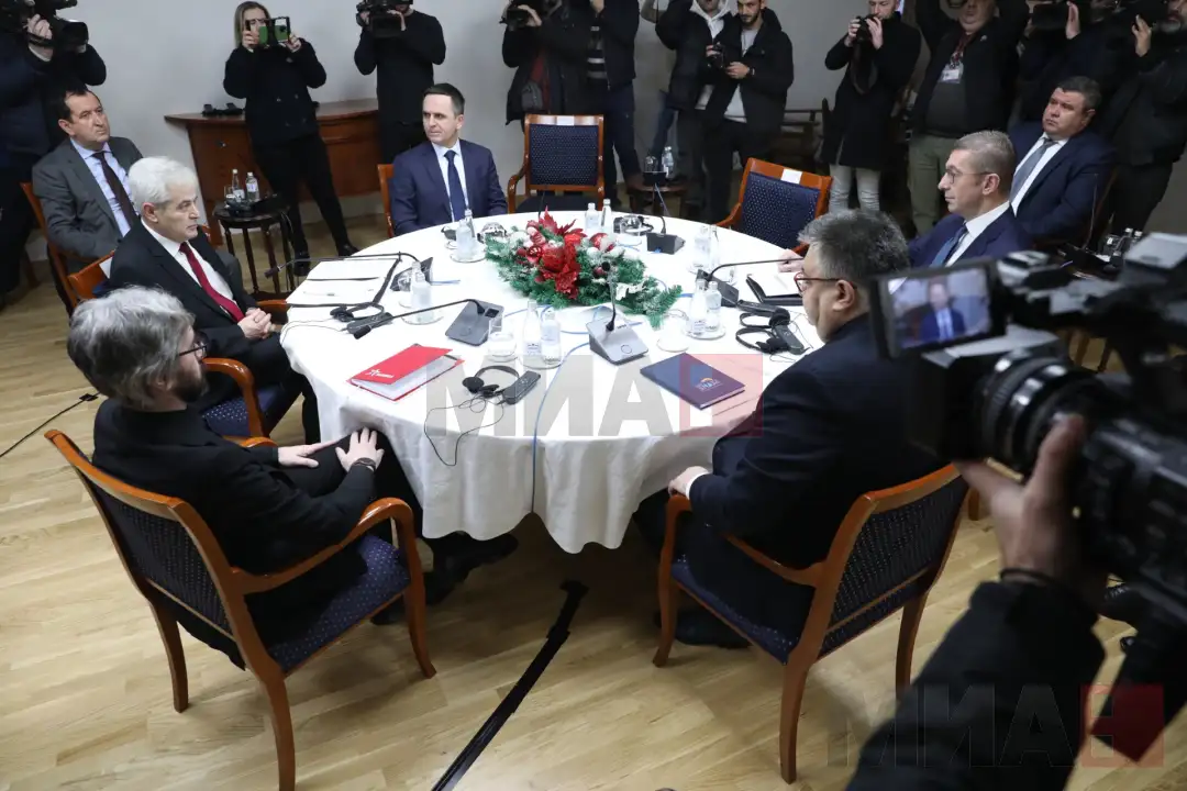 Во Клубот на пратениците почна лидерската средба што ја иницира премиерот и претседател на ВМРО-ДПМНЕ, Христијан Мицкоски. Покрај Мицкоски, кој е придружуван од координаторот на пратеничката група на ВМРО-ДПНМНЕ, Никола Мицевски, на средбата од коалициските партнери во Владата присуствува генералниот секретар на ЗНАМ и министер за јавна администрација, Горан Минчев, како и градоначалникот на Тетово, Биљал Касами од коалицијата „Вреди“. Од опозициските пратенички групи присутни се лидерите на Левицата и на ДУИ, Димитар Апасиев и Али Ахмети.