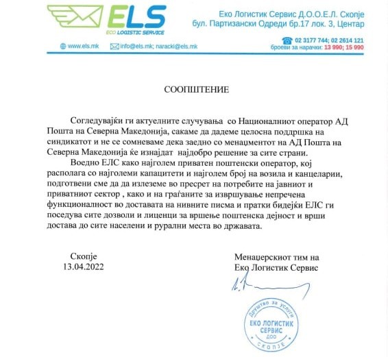 Од приватниот поштенски оператор „ЕЛС“ излегоа со соопштение дека се подготвени да му излезат во пресрет на јавниот и приватниот сектор за непречена достава на писмата и пратките.