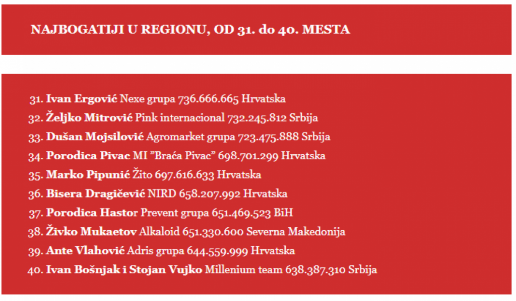 Во овој дел од листата на 100 најбогати во регионот, доминираат бизнисмени од Хрватска и Србија, но има и една бизнис империја од БиХ, семејството Хастор.
