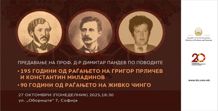 Во македонскиот Културно-информативен центар (КИЦ) во Софија, вечер (18:30), ќе се одржи предавање на проф. д-р Димитар Пандев по повод 195 години од раѓањето на Григор Прличев и Константин Миладинов и 90 години од раѓањето на Живко Чинго.