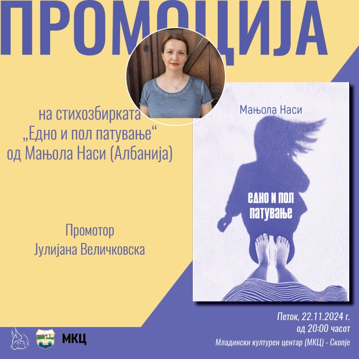 Во Скопје денеска ќе биде промовирана стихозбирката „Едно и пол патување“ од современата албанска поетеса Мањола Наси. Книгата ќе ја промовира Јулијана Величковска.