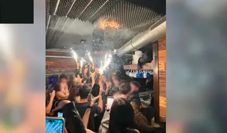Фотографијата објавена на веб-страницата на БФМ ги прикажува гостите на барот, претежно млади луѓе, како држат шишиња шампањ високо во рацете, со прскалки во нив, додека искри се расфрлани нагоре, близу таванот. Пламенот е видлив и на еден дел од таванот.