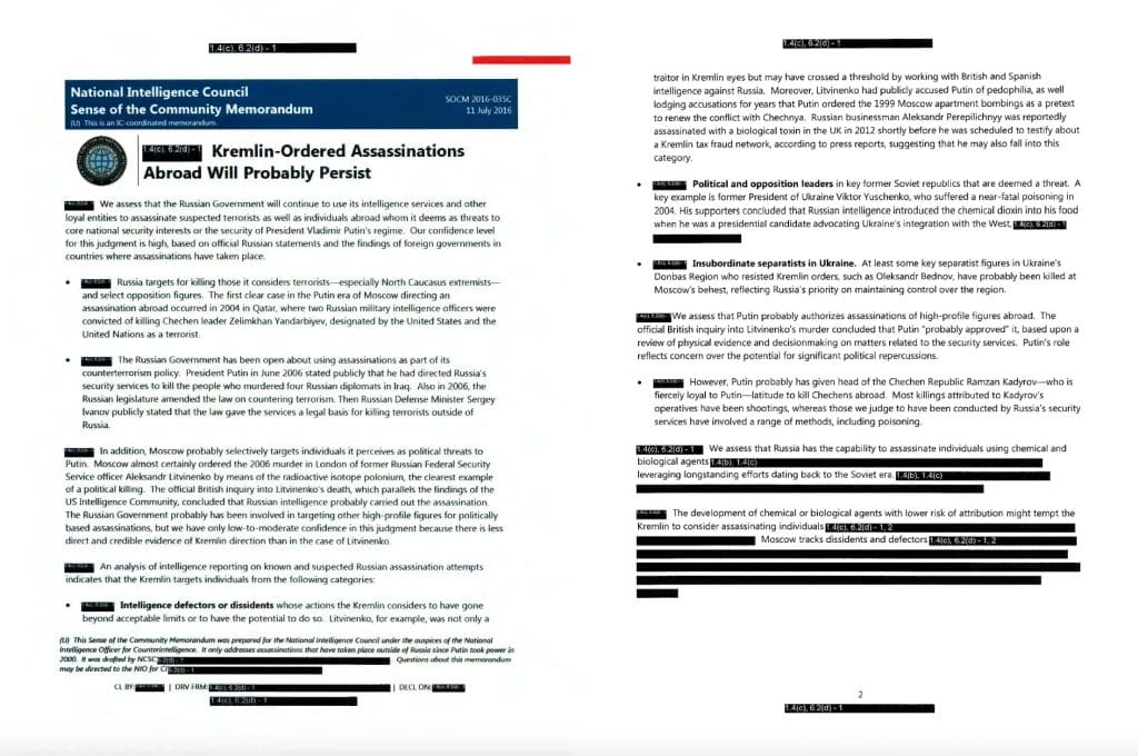 Националната разузнавачка служба на САД декласифицираше дел од тајни документи, наоди и информации за убиствата во странство на политичките противници на претседателот на Русија Владимир Путин