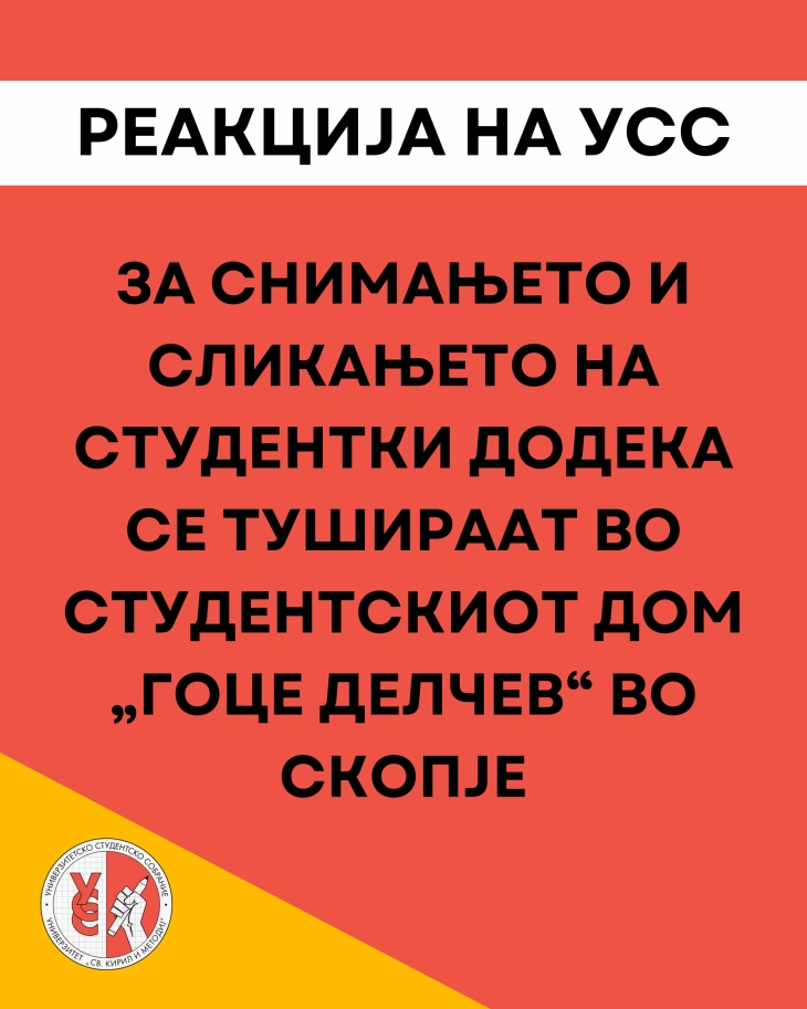 Со најголема вознемиреност и гнев реагираме на информацијата за снимање и сликање на студентки во бањите на студентскиот дом „Гоце Делчев“. Ова не е „несреќен случај“ или „непромисленост“, туку акт на сексуално насилство и повреда на основните човекови права, вели Универзитетското студентско собрание при Универзитетот „Св. Кирил и Методиј“ – Скопје (УСС-УКИМ), во реакција за снимањето и сликањето на студентки додека се тушираат во студентскиот дом „Гоце Делчев“ во Скопје, што го објавуваме интегрално.