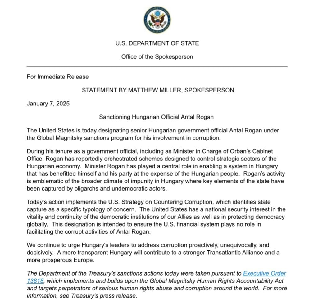 Американското Министерство за финансии денеска соопшти дека вовело санкции за шефот на кабинетот на унгарскиот премиер Виктор Орбан, Антал Роган, поради сомневање дека е вмешан во корупција во Унгарија.