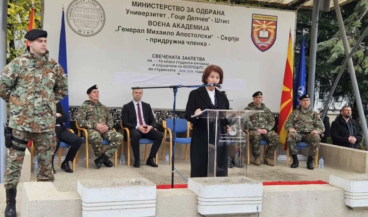 Таа нагласи дека новите офицери стапуваат во служба во време на глобални предизвици, воени конфликти и геополитички тензии, и дека од нив се очекува да ги почитуваат највисоките професионални и морални стандарди. Претседателката потсети на значењето на Воената академија како темелна институција за одбранбено образование, која не само што ги образува идните македонски офицери, туку и промовира регионална соработка.