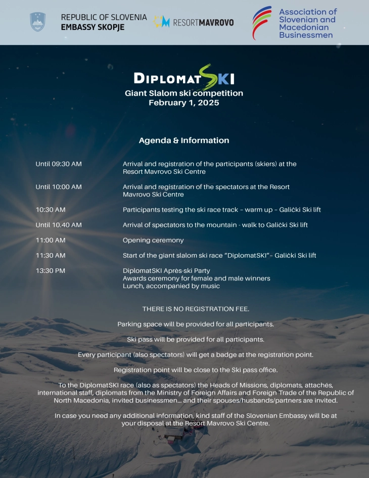 Амбасадата на Словенија во Скопје, во соработка со Маврово Ресорт и Здружението на словенечки и македонски стопанственици, денеска организираат скијачки натпревар „ДипломатСКИ“ во Маврово.