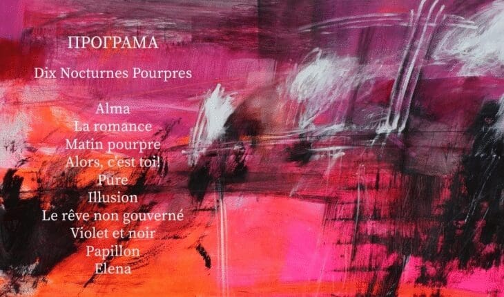 Програмата ги опфаќа десетте пиеси од циклусот: Alma, La romance, Matin pourpre, Alors c’est toi!, Pure, Illusion, Le rêve non gouverné, Violet et noir, Papillon, Elena – дела што ја спојуваат лиричноста, модерната хармонска мисла и впечатливата звучна естетика на авторот.
