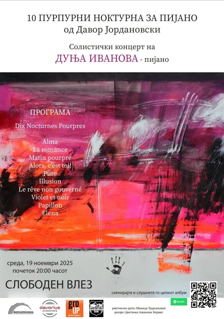 Во Камерната сала на Филхармонија вечер ќе се одржи солистички концерт на пијанистката Дуња Иванова. Публиката ќе има можност ексклузивно да го слушне циклусот „10 Пурпурни Ноктурна за пијано“ од македонскиот композитор Давор Јордановски.