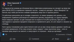 „Се работеше деноноќно да се изнајде сторителот, се земаа предвид сите докази, а по извршените службени разговори во изминатите денови, вчеравечер, со судска наредба, беше извршен претрес на две локации кои ги користи Л.А.(34) од Битола, при што се пронајдени и одземени предмети поврзани со кривичното дело, по што лицето е лишено од слобода“ напиша Спасовски.