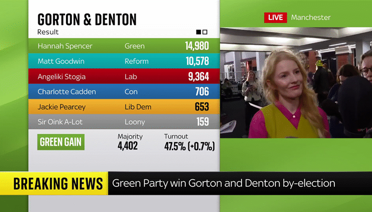 Ова е прв пат Зелената партија, која се залага за излез на Велика Британија од НАТО и легализација на рекреативните дроги, да победи на еден избор за парламентарно место или да освои место на северот од Англија. Ова го зголеми бројот на претставници на Зелената партија во Долниот дом на пет од вкупно 650 места.