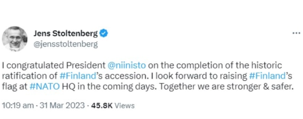 – Сите 30 сојузници на НАТО сега го ратификуваа Протоколот за пристапување. Финска формално ќе се приклучи на нашиот сојуз во наредните денови, рече Столтенберг.