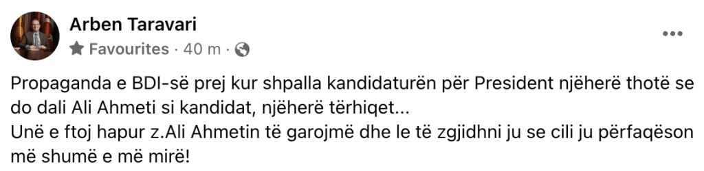 „Пропагандата на ДУИ, откако ја објавив мојата кандидатура за претседател, некогаш вели дека Али Ахмети ќе се кандидира, некогаш се повлекува … Отворено го поканувам господинот Али Ахмети да се натпреварува со мене и да вие изберете кој најдобро ве застапува!“ – пишува Таравари на Фејсбук.