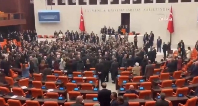 Претседателот на парламентот, Нуман Куртулмуш, беше принуден да ја прекине седницата, додека безбедносните сили се обидуваа да ги разделат пратениците во конфликт.