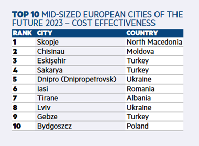 Скопје се најде на врвот на ТОП 10 европски градови со средна големина според ефективноста, односно рентабилност за инвестирање на рангирањето кое го прави економското списание ФДИ интелеџенс, дел од реномираниот меѓународен весник за економија, Фајненшл Тајмс.