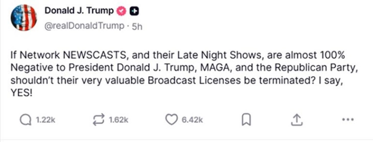 – Ако телевизиските информативни емисии и нивните доцна вечерни емисии речиси сто отсто се негативни кон претседателот Доналд Ј. Трамп, „МАГА“ и Републиканската партија, зарем не би требало да бидат одземени нивните вредни концесии за емитување? Јас велам: ДА! – објави Трамп на сопствената социјална мрежа „Трут соушл“ (Truth Social).