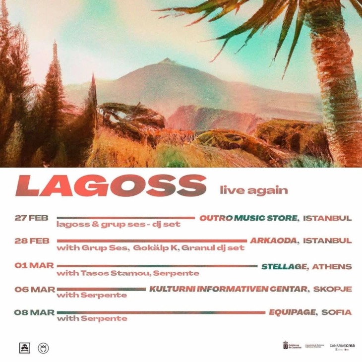 По концертите во Истанбул, Атина и Софија и Скопје е на мапата на турнејата на бендовите LAGOSS и проектот Serpente од Канарските острови. Ова експериментално сајбер-тропско музичко трио од Тенерифе ќе настапи вечер во Салонот 19:19 во Културно – информативниот центар.