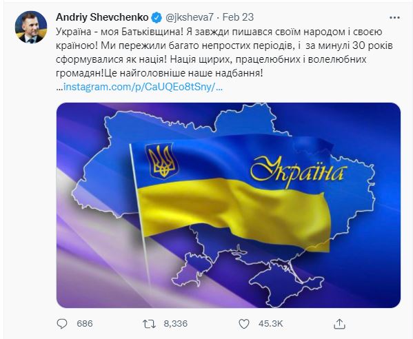 „Украина е мојата татковина! Секогаш бев горд на мојот народ и на мојата земја! Поминавме низ многу тешки времиња, и во овие 30 години се оформивме како нација! Нација на искрени, работливи и слободољубиви граѓани! Тоа е најважното што го имаме!, рече Шевченко, споделувајќи слика од мапата на Украина и нејзиното знаме и грб.
