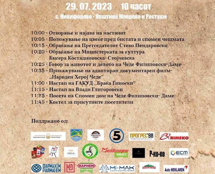 Утре во селото Ниќифорово, родното место на народниот херој од НОВ, Чеде Филиповски-Даме, со пригодна програма ќе бидат одбележани 100 години од неговото раѓање.