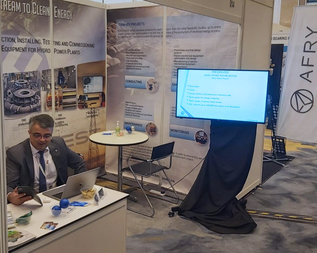 Тодор Анѓушев, директор на фирмите ЕМС и „Мали хидро електрани“, во рамките на ФЕРО ИНВЕСТ и Филип Андрески, директор за развој во групацијата, ги запознаа посетителите на саемот со можностите на ФЕРО ИНВЕСТ како партнер во изведувањето на енергетски проекти, прикажувајќи го портфолиото од реализирани над 120 електрани, од кои над 60 се поврзани директно со мали хидроелектрани.