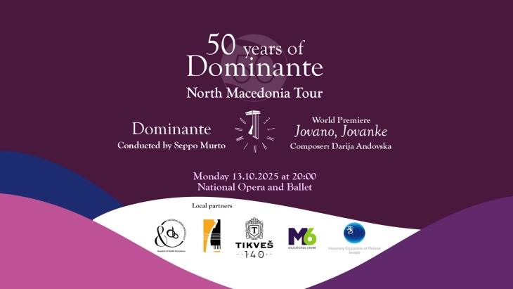 Мешаниот хор „Доминанте“ (Dominante) од Финска во рамките на нивната турнеја по повод 50-годишнината од основањето, вечер од 20 часот во фоајето на Националната опера и балет ќе изведе разновидна програма со дела од светскиот репертоар, како и праизведба на композицијата „Јовано, Јованке“ од македонската композиторка Дарија Андовска.