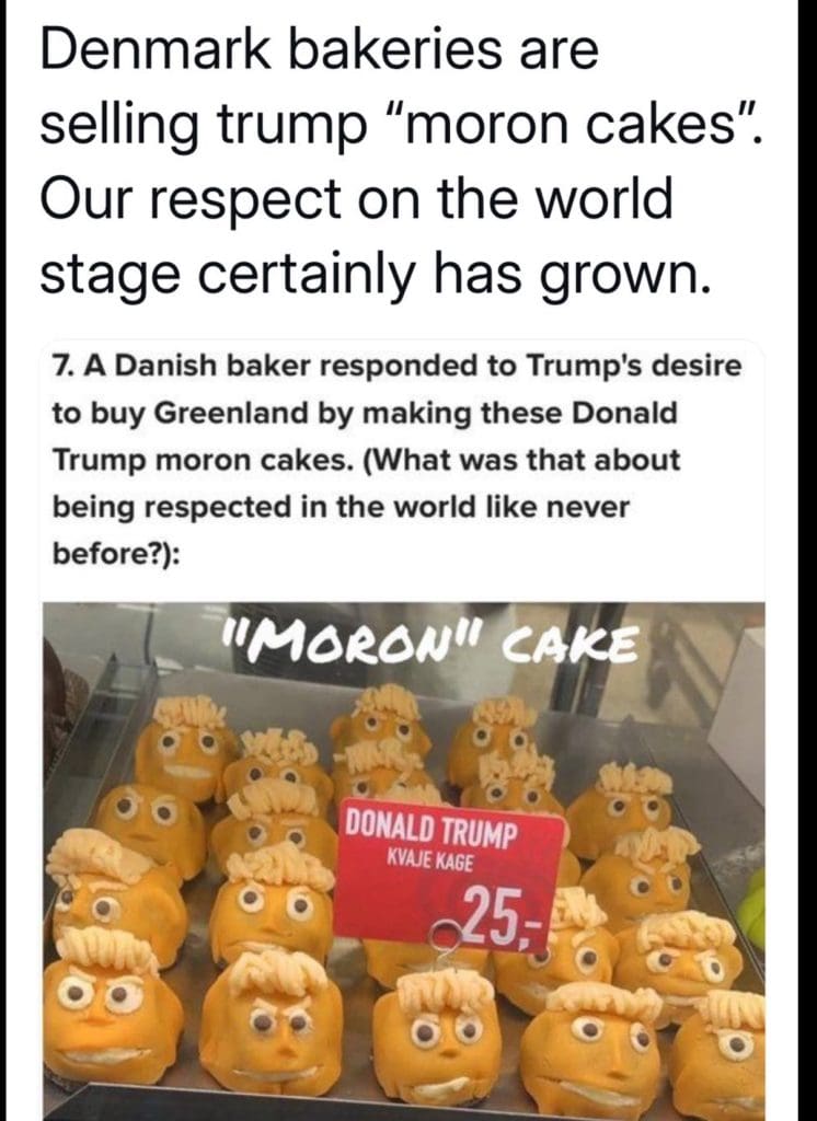 Како реакција на настојувањата на претседателот на САД, Доналд Трамп, да го преземе Гренланд, слаткарница во Данска почна да продава колачи со неговиот лик, нарекувајќи ги „Морон колач“.