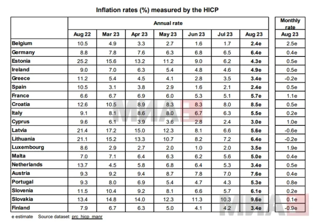По земји, највисока стапка на инфлација има Словачка од 9,6 проценти, пред Хрватска со 8,5, Австрија од 7,6, Германија и Литванија по 6,4 и Словенија од 6,1 отсто. Најмала инфлација во август имале Белгија и Шпанија од 2,4 отсто, пред Кипар со три и Грција, Финска и Холандија со по 3,4 проценти. Франција и Италија се на средината на табелата со инфлациски стапки од 5,7, односно 5,5 отсто.