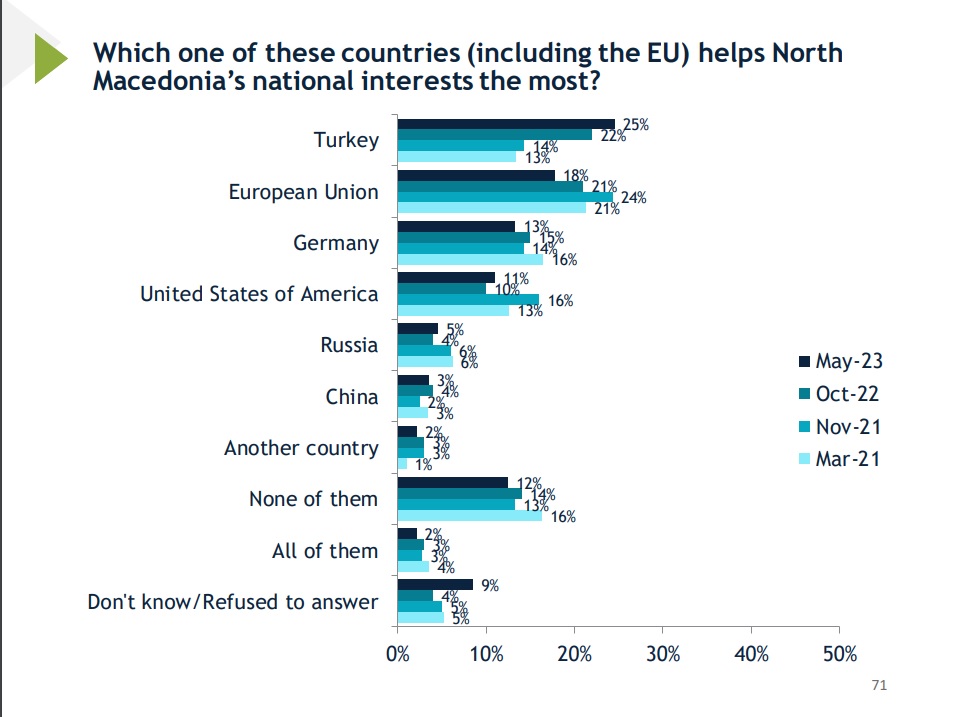 Граѓаните сметаат дека Турција е земја која најмногу ги штити националните интереси на С. Македонија (25%), додека Европската Унија е на второ место (18%). Меѓу првите пет одговори се уште и Германија (13%), „Никој“ (12%) и САД (11%).