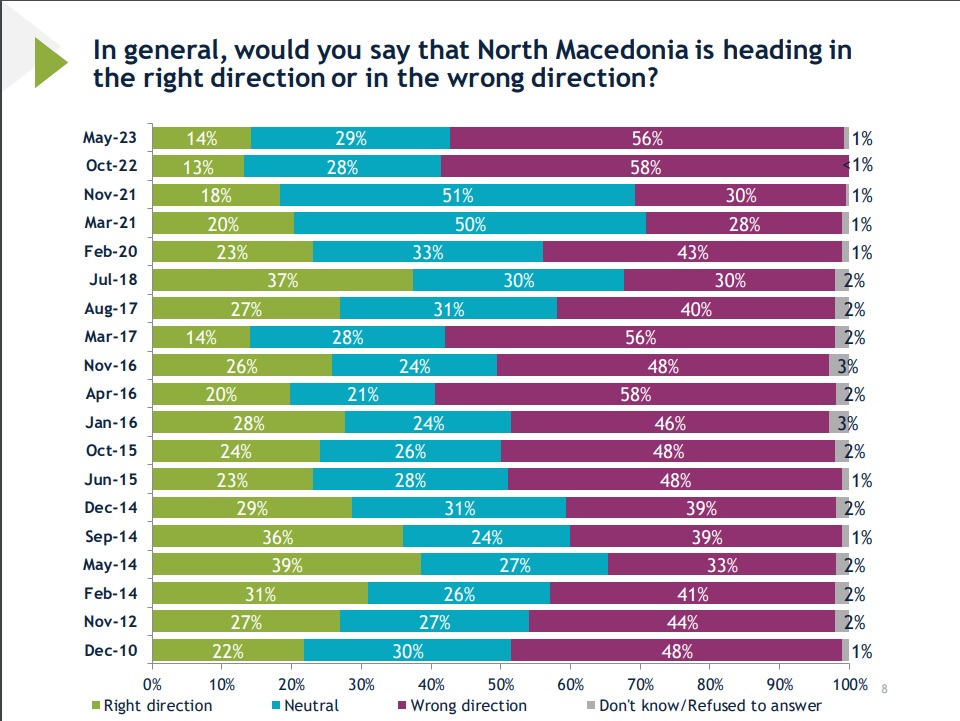 Во истражувањето направено во периодот на март и април годинава, дури 56% од македонските граѓани сметаат дека државата се движи во погрешен правец, 29% се неутрални додека само 14% од анкетираните изјавиле дека С. Македонија се движи во правилна насока.