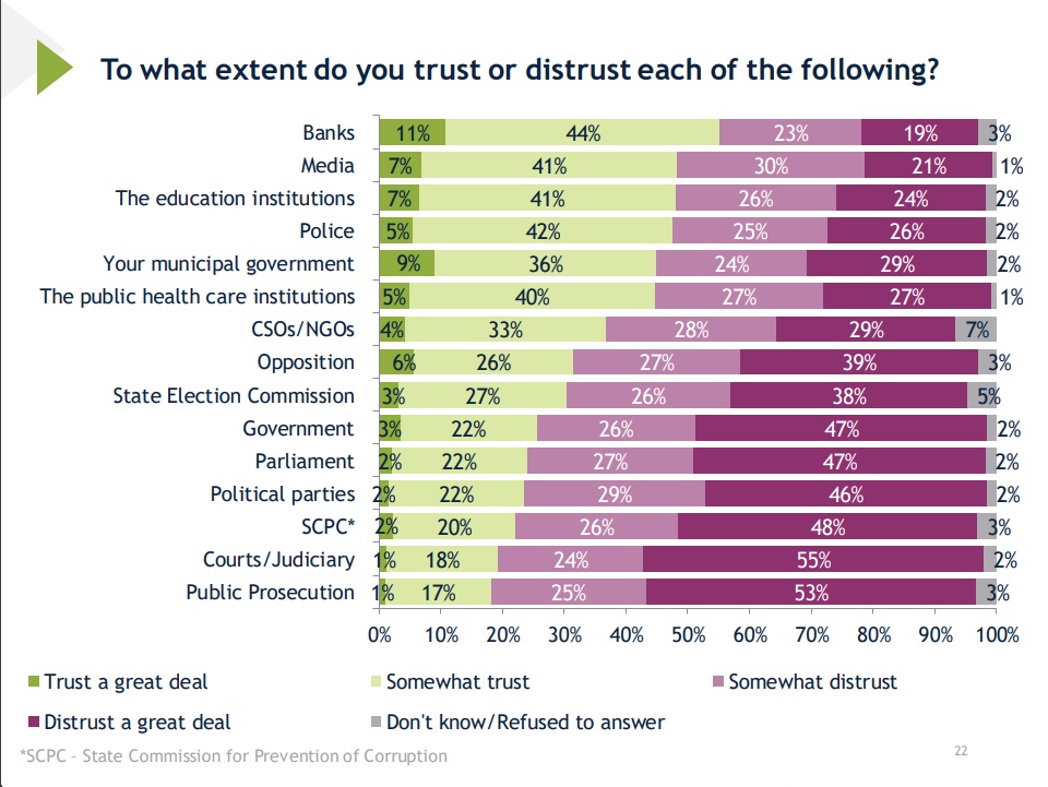 Најниска доверба македонските граѓани имаат во обвинителството и судството, каде само 1% од анкетираните имаат целосна доверба во овие институции, додека повеќе од половина од анкетираните имаат целосна недоверба. Многу ниска доверба има и Државната комисија за спречување на корупцијата, политичките партии, Собранието и Владата. Наспроти ова, граѓаните изразиле најмногу доверба во банките, медиумите, образовните институции, полицијата и општинските власти.