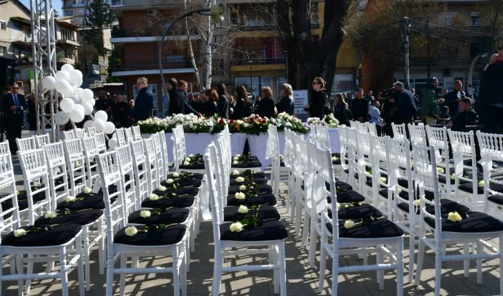 – 63 бели столчиња, 63 имиња, 63 животи што недостигаат – секое столче ја носи тишината на едно отсутно присуство, бела роза за спомен, светлина за сеќавање и место што никогаш нема да биде исполнето – беше пораката со која многуте делегации ги пречекаа семејствата на загинатите и другите пред Домот на културата во Кочани.