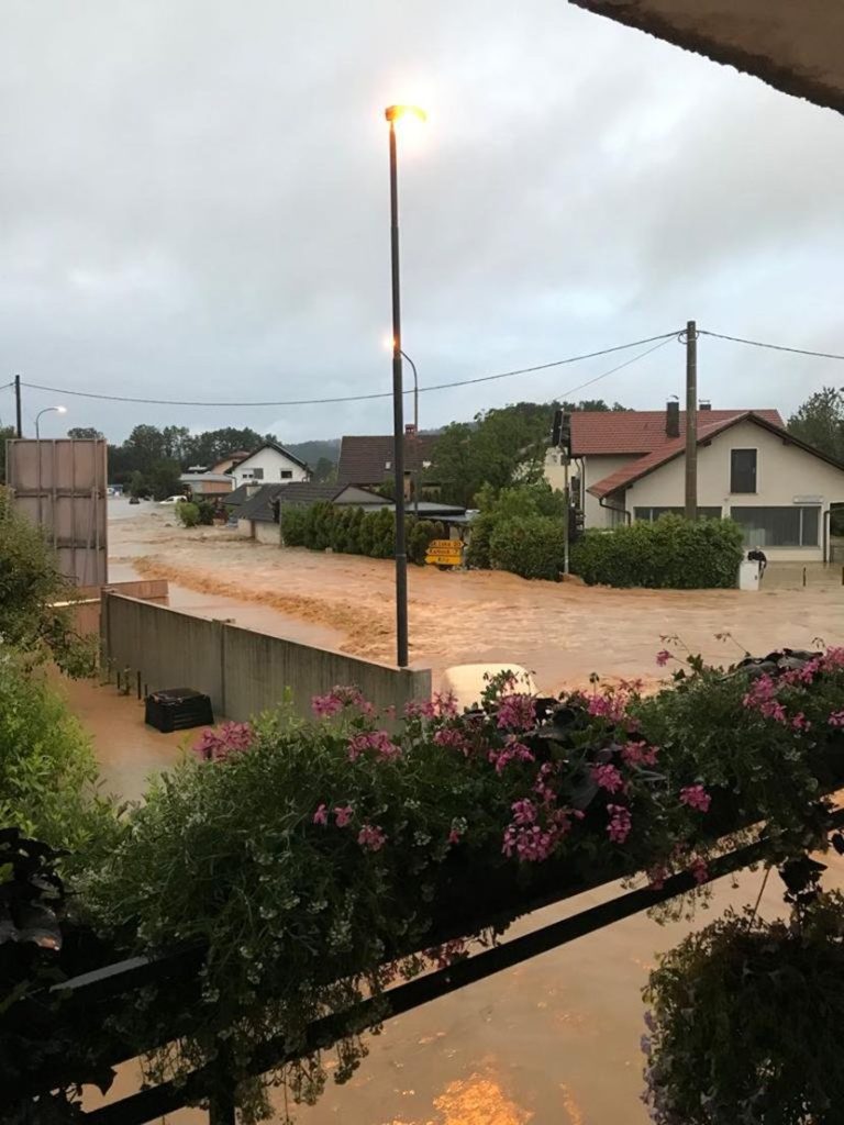Според 24ур, водата навлегува во куќите во Коменда, поплави има низ западна и северна Словенија, а затворени се и некои патишта.