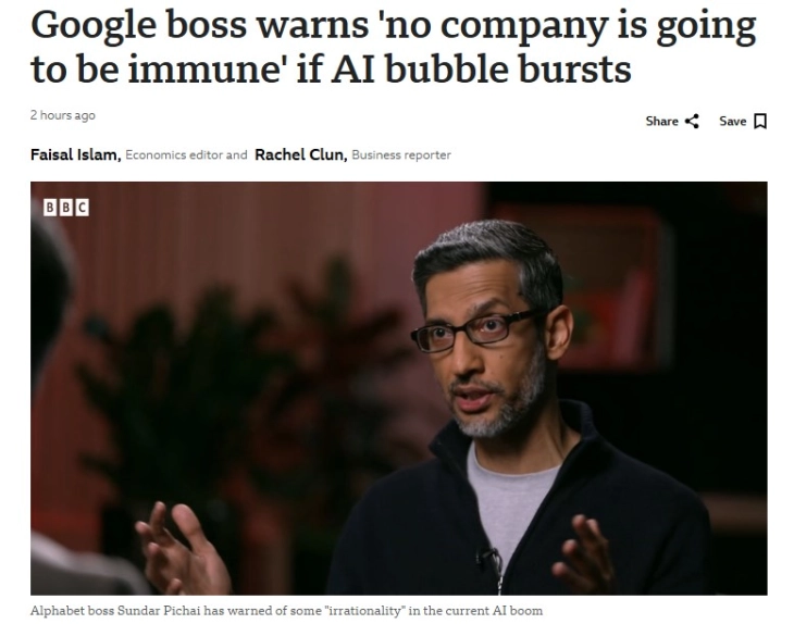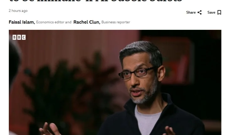 На прашањето дали Гугл би бил имун на последиците од пукање на балонот со ВИ, Пичаи рече дека технолошкиот гигант би можел да го преброди тој потенцијален удар, но издаде и предупредување.