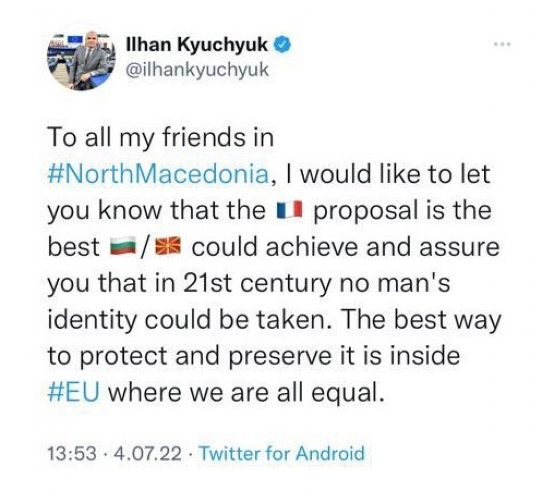Европратеник од Бугарија – Илхан Ќулук на Твитер упати порака до македонските граѓани дека францускиот предлог е најдобриот што може да го добијат.
