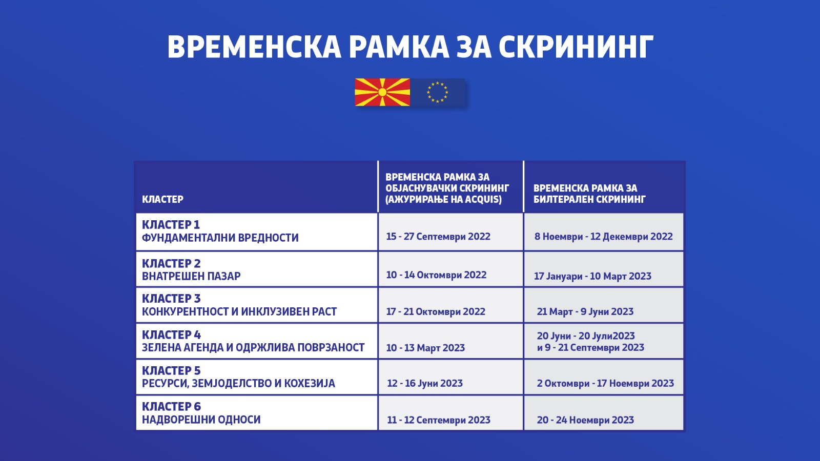 Заменик претседателот на Владата задолжен за европски прашања, Бојан Маричиќ на денешната прес-конференција го најави првиот скрининг Извештај за Кластерот „Фундаментални вредности“ кој земјава, согласно најавите од Брисел, го очекува во првиот квартал од 2023 година.